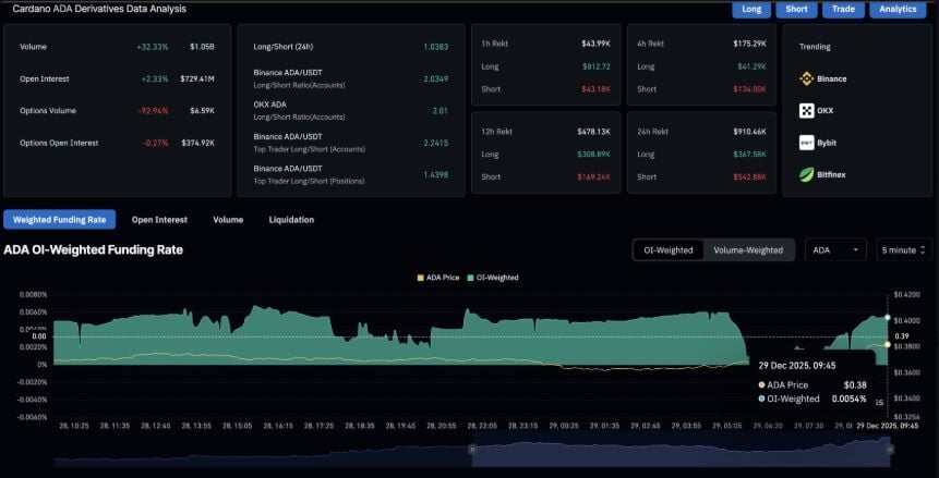 En cuanto a los derivados, los datos de CoinGlass muestran que el interés abierto (OI) en futuros de Cardano ha subido un 2.33% en las últimas 24 horas, alcanzando los 729.41 millones de dólares. Esto indica una acumulación de posiciones a medida que los operadores aumentan su exposición al riesgo.
