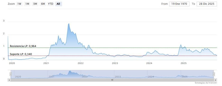 El soporte a mediano y largo plazo se encuentra en los 0.34 dólares. Mientras, los indicadores de Ei se muestran mixtos.