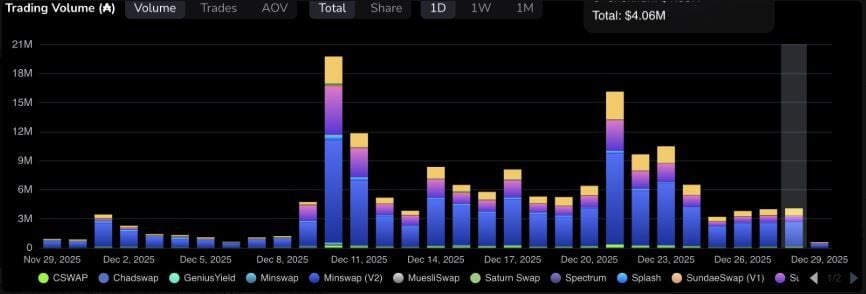 Los datos de Taptools muestran un aumento en el volumen de negociación en el ecosistema de Cardano, que ascendió a 4.06 millones de dólares el domingo, desde los 3.19 millones de dólares del jueves. Esto indica una recuperación del interés de los usuarios, que se ha mantenido estable desde el lanzamiento de Midnight, la cadena lateral de Cardano centrada en la privacidad.