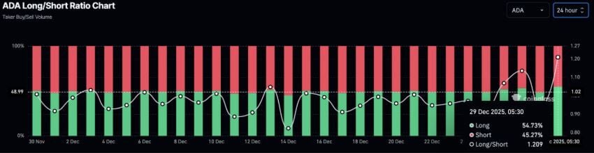 Como aspecto más positivo, la tasa de financiación ponderada por OI del 0.0054% refleja una tendencia alcista en el sentimiento de los derivados, ya que los operadores pagan una prima por mantener posiciones largas. Además, la relación entre posiciones largas y cortas indica que las posiciones largas representaron el 54.73% el lunes, frente al 48.42% del domingo. Podría observarse un posible repunte en Cardano impulsado por el apalancamiento a medida que se fortalece la acumulación de posiciones largas.