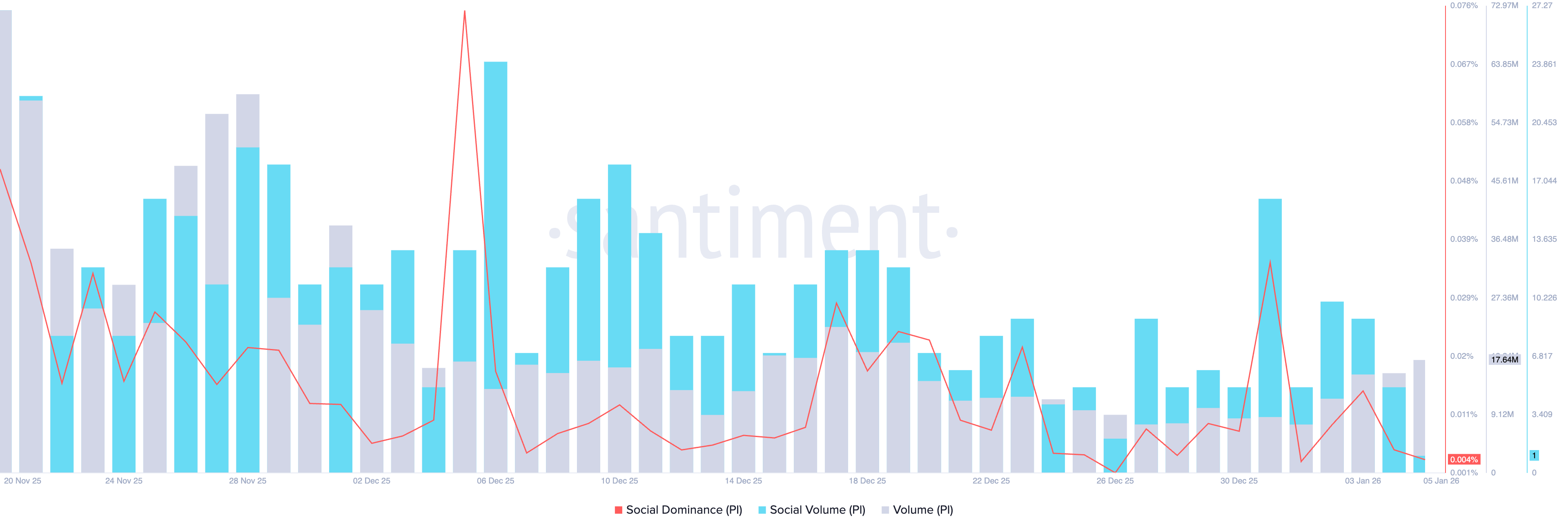Los datos de Santiment muestran que la dominancia social, que rastrea la participación de Pi Network en los medios cripto, cae al 0.004% el lunes, mientras el volumen social continúa su tendencia a la baja. A pesar del interés minorista limitado, el volumen de operaciones de Pi Network alcanzó casi 18 millones de PI el lunes, el más alto desde el 18 de diciembre.