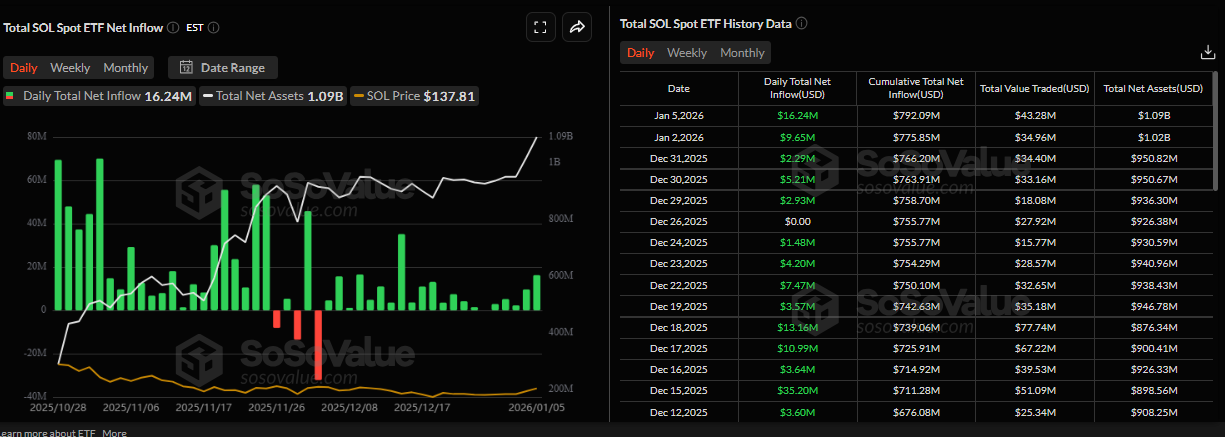 La demanda institucional por Solana ha seguido creciendo desde su lanzamiento el 28 de octubre. Los datos de SoSoValue muestran que los ETFs de Solana al contado registraron 16.24 millones de dólares en entradas el lunes, la mayor entrada en un solo día desde mediados de diciembre. Además, los activos netos totales superaron los 1.000 millones de dólares hasta ahora esta semana, lo que sugiere un aumento en la demanda institucional. Si las entradas continúan e intensifican, SOL podría ver un repunte en su precio.