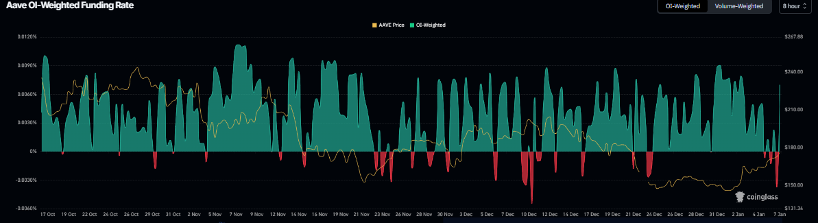 En el lado de los derivados, los datos de la tasa de financiación de AAVE también sugieren un sesgo alcista. Los datos de la Tasa de Financiación Ponderada por OI de Coinglass muestran que el número de operadores que apuestan a que el precio de Aave caerá más es menor que aquellos que anticipan un aumento del precio.