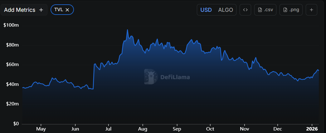 Los datos de DefiLlama muestran que el Valor Total Bloqueado (TVL) de Algorand ha estado aumentando constantemente desde mediados de diciembre y actualmente se sitúa en 54,70 millones de dólares. Este aumento en el TVL indica una creciente actividad e interés en el ecosistema de Algorand, sugiriendo que más usuarios están depositando o utilizando activos en protocolos basados en ALGO.