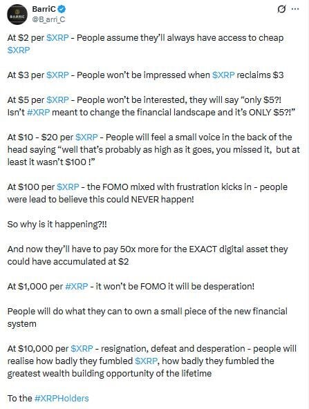 Según BarriC, el miedo a perderse algo es lo que finalmente impulsará el precio de XRP a niveles de tres dígitos. En su opinión, una vez que XRP alcance los 100 dólares, la incredulidad se derrumbará y será reemplazada por frustración y urgencia, especialmente entre los inversores que desde hace tiempo habían aceptado la idea de que tales precios eran imposibles.