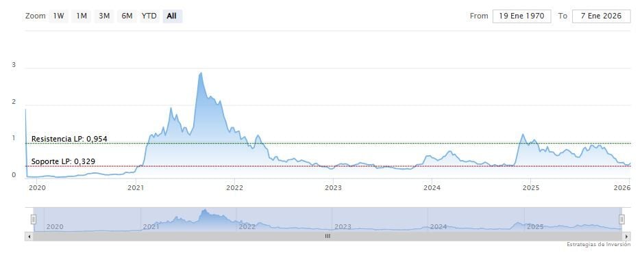 Sin embargo, el precio permanece limitado por la resistencia cerca de 0.401 dólares, un nivel que se alinea con la media móvil de 50 días y que ha rechazado múltiples intentos de ruptura desde finales de 2024. Un movimiento sostenido por encima de esta zona se considera ampliamente necesario para un mayor impulso alcista hacia rangos históricos más altos.