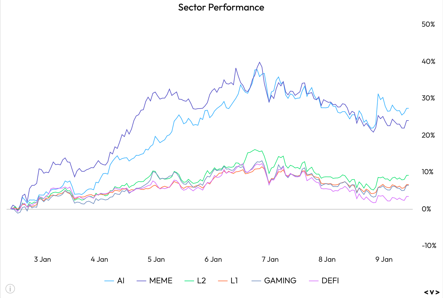 Cabe destacar que sectores como la IA y los memes han mostrado una fortaleza significativa, creciendo un 27% y un 23% respectivamente.