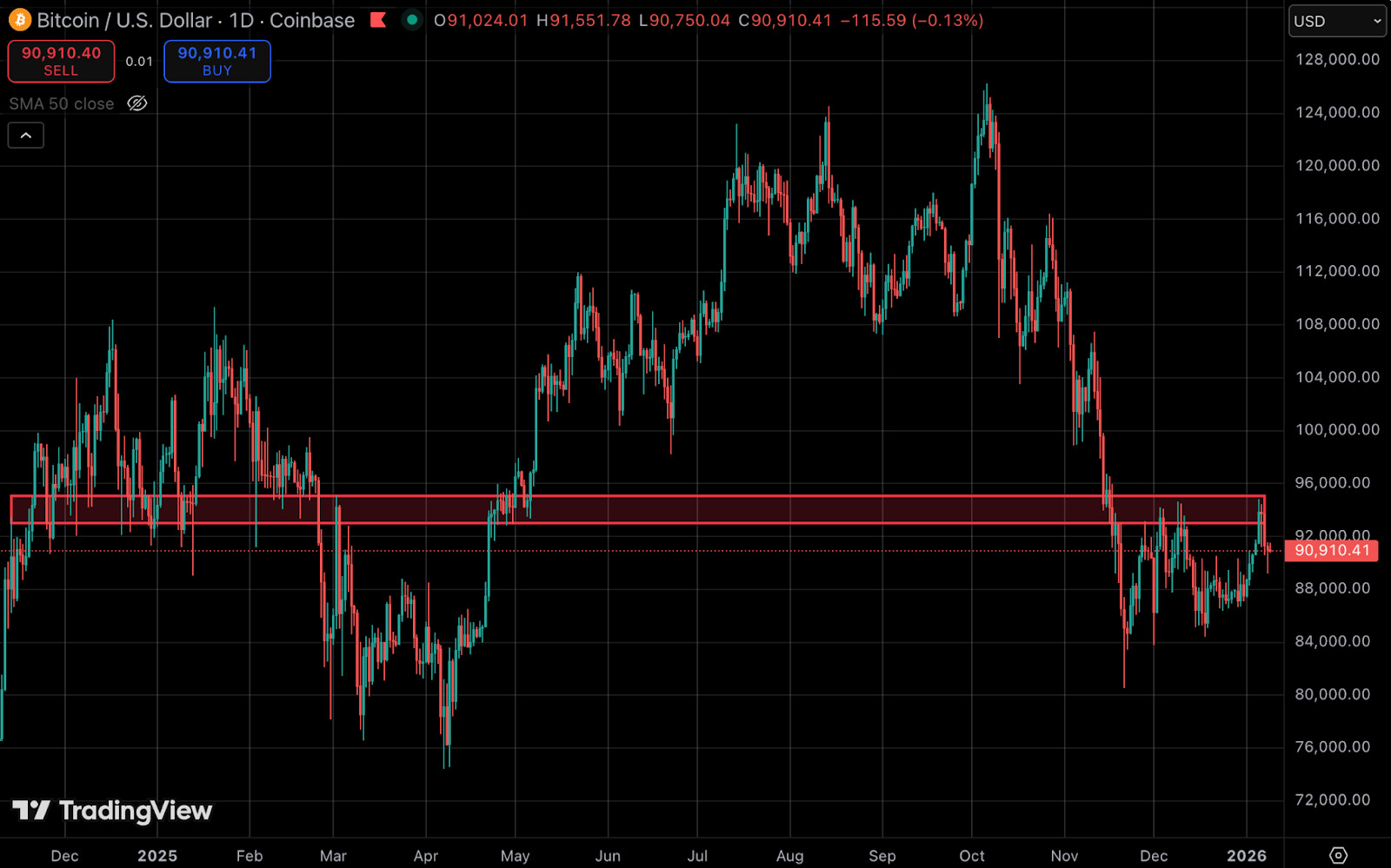 Si bien 2026 ha mostrado indicios tempranos de un cambio de tendencia, aún existen niveles clave que deben recuperarse en el gráfico. Hasta ahora, lo positivo es que, a pesar de que BTC ha rechazado la zona de los $94,000, ha rebotado perfectamente desde la media móvil simple de 50 días, que ha actuado como soporte en anteriores subidas. A corto plazo, superar la resistencia de los $95,000 y considerarla como soporte será un catalizador crucial para mejorar la confianza de los traders.