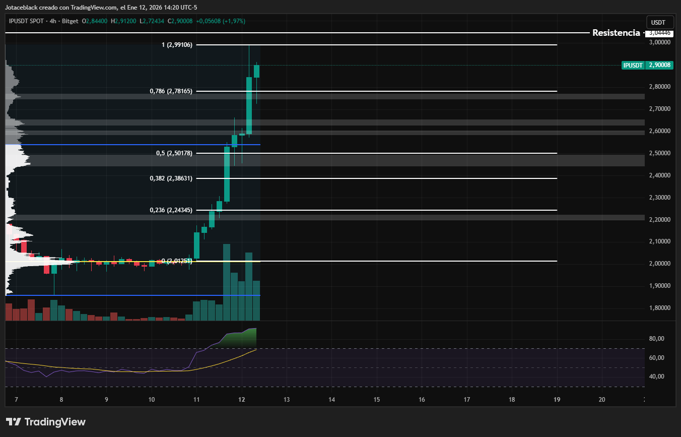 El par IP/USDT en temporalidad 4H viene de un impulso vertical que llevó el precio hasta $2,9120 y ahora cotiza cerca de $2,9001. En este contexto, la zona de resistencia inmediata queda definida en torno a los $2,9911 y, posteriormente, el nivel psicológico de los $3,0445.