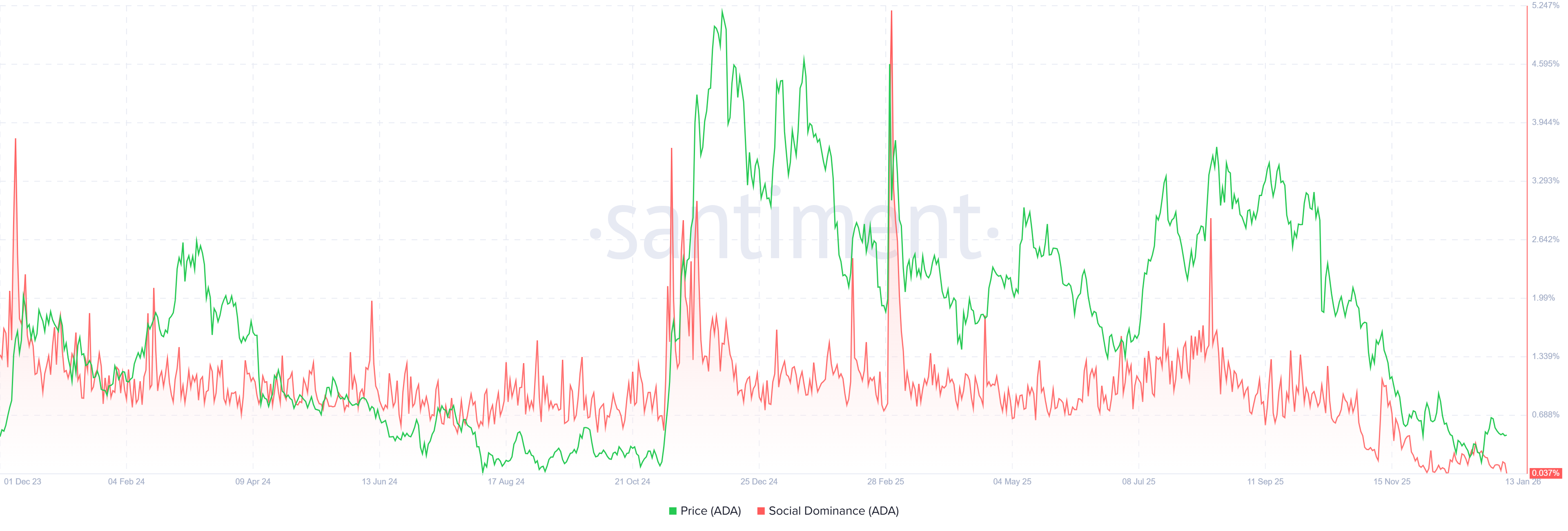 El dominio social de Cardano se refiere a la participación de las discusiones relacionadas con ADA en los medios de criptomonedas, lo que apoya un caso bajista. Los datos de Santiment indican que, entre todas las discusiones en medios de criptomonedas, la participación de ADA es del 0.037%, el nivel más bajo desde principios de diciembre y también ha estado cayendo desde principios de enero. Esta disminución indica una atención inversora decreciente y un interés especulativo reducido, lo que a menudo coincide con una demanda más suave y un impulso de precios más débil a corto plazo.