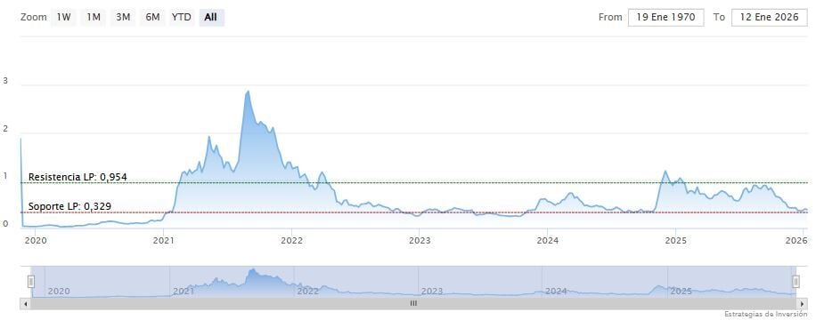 Si el precio cierra por debajo de los 0.38 dólares en el gráfico diario, aumenta el riesgo de caída. El siguiente nivel destacable se sitúa cerca del mínimo del 31 de diciembre, en torno a los 0.32 dólares, lo que marcaría una corrección mucho más profunda.