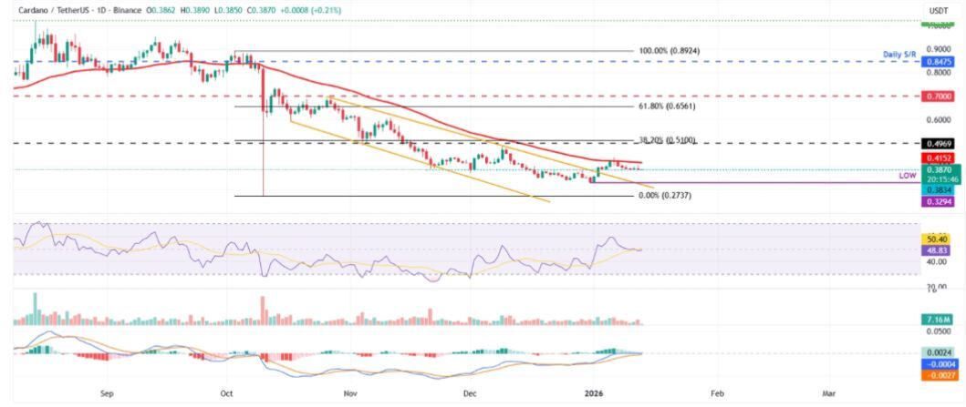 Desde una perspectiva técnica, el gráfico se acerca a una decisión. ADA fue rechazada cerca de la media móvil exponencial (EMA) de 50 días, en torno a los 0.41 dólares, el 6 de enero y desde entonces ha caído cerca de un 9%, lo que ha llevado el precio de vuelta al soporte diario de 0,38 dólares. A fecha del martes, ADA se mantiene justo por encima de ese nivel, sin rebotar de forma convincente, pero tampoco rompiéndolo.