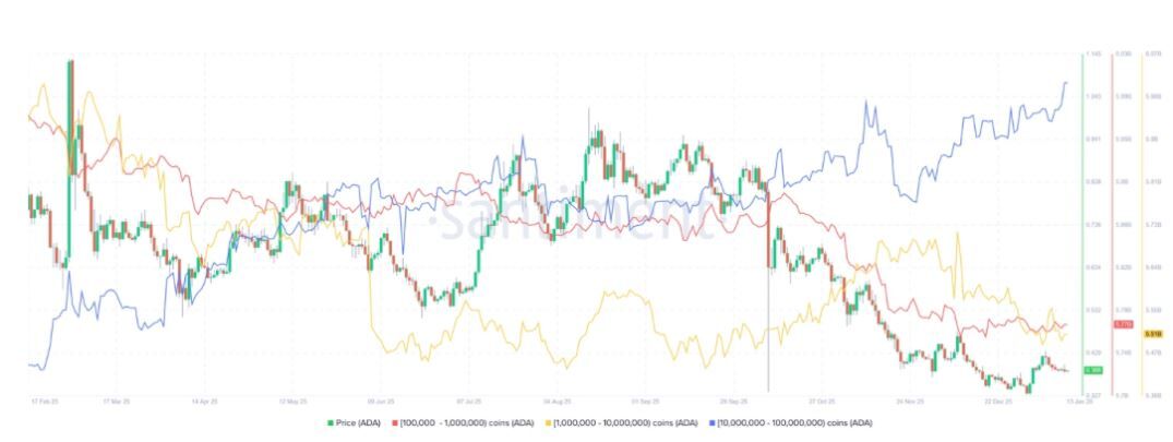 Los datos on-chain de Santiment presentan un panorama con matices. Las ballenas con entre 10 y 100 millones de ADA han ido acumulando activos de forma constante durante la reciente caída. Desde el 8 de enero, este grupo ha añadido aproximadamente 180 millones de ADA a sus tenencias, lo que sugiere confianza en los niveles actuales, en lugar de pánico.