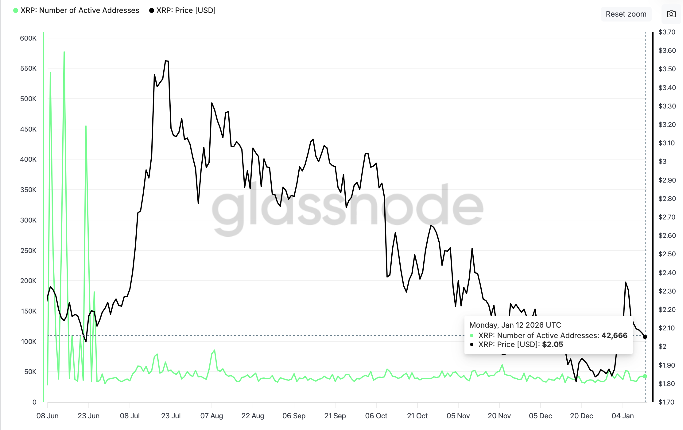 El número de direcciones que realizan transacciones activamente en el libro mayor de XRP (XRPL) ha disminuido en un 17.5% a aproximadamente 42,600 a partir del lunes, desde 51,500 registradas el 5 de enero, según los datos de Glassnode.