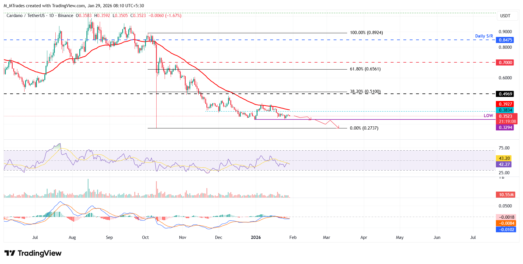 Si $ADA continúa su tendencia a la baja, podría extender la caída hacia el mínimo del 31 de diciembre de 0.32$. Un cierre por debajo de este nivel podría extender una corrección más profunda hacia el mínimo del 10 de octubre de 0.27$.