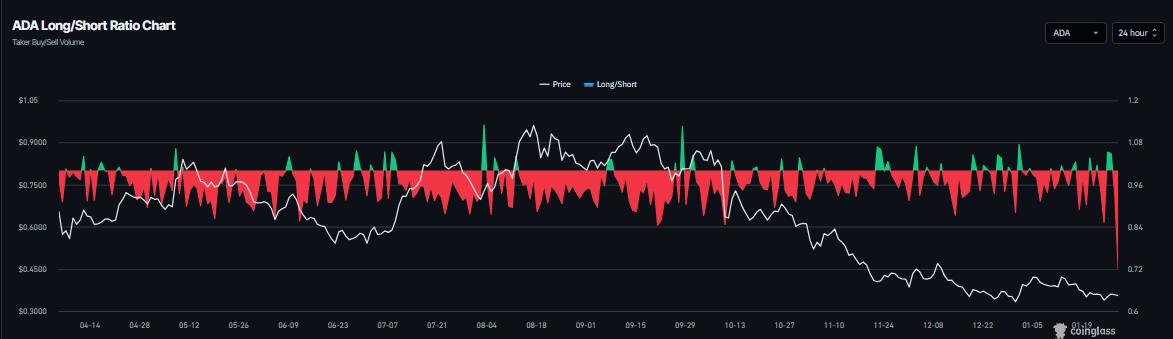 Además, los datos de derivados también respaldan una perspectiva bajista para Cardano a corto plazo. La relación larga-corta de CoinGlass para $ADA se sitúa en 0.71 el jueves, las apuestas cortas más altas en más de un mes. La relación por debajo de uno indica que los operadores están apostando a que el precio del activo caerá.