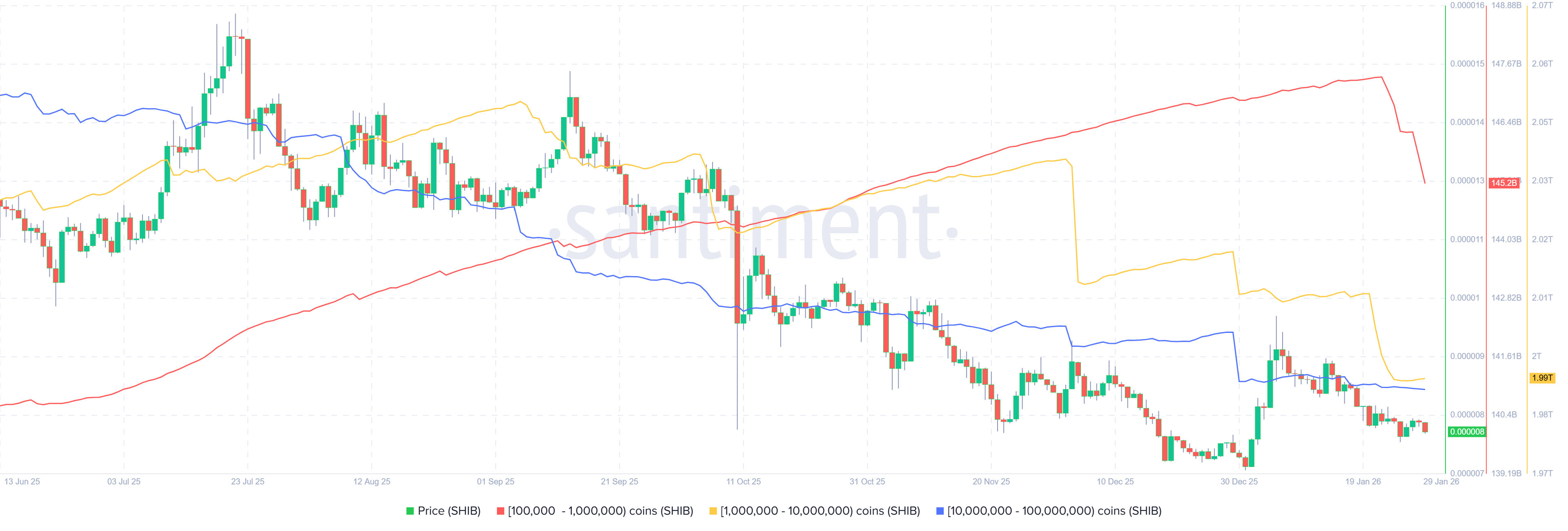 La métrica indica que las ballenas que poseen entre 100.000 y 1 millón (línea roja), 1 millón y 10 millones (línea amarilla), y 10 millones y 100 millones (línea azul) han descargado un total de 32.17 mil millones de tokens $SHIB desde el 20 de enero hasta el jueves, aumentando así la presión de venta.