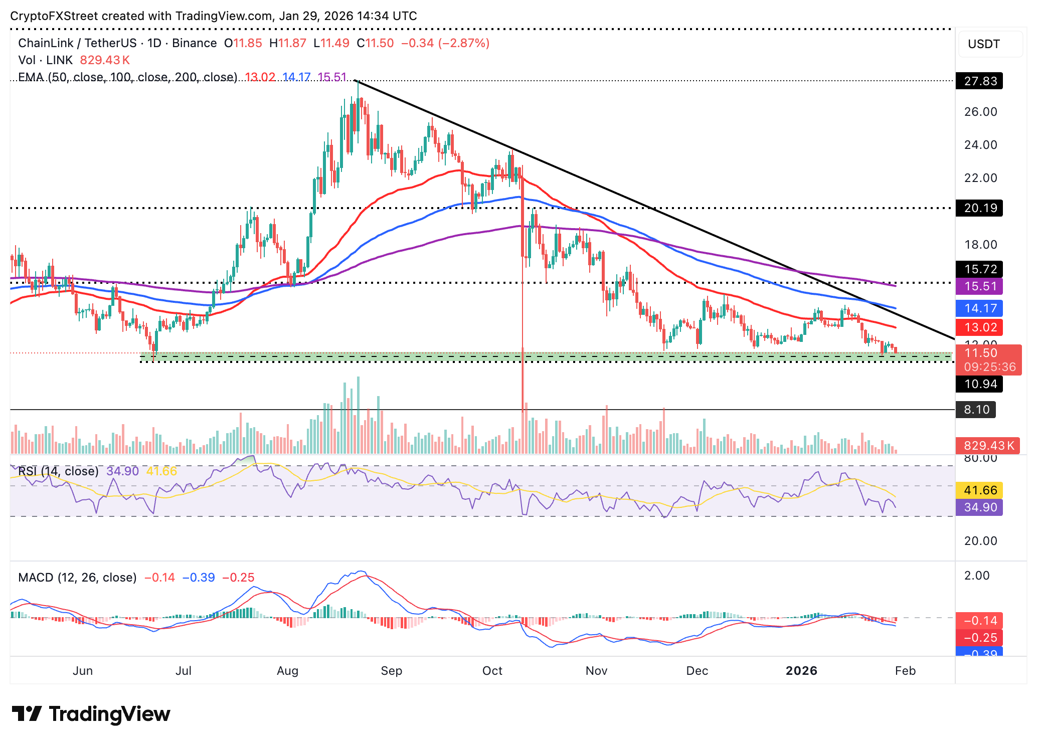 Chainlink ($LINK) se cotiza a 11.16$ en el momento de escribir este artículo el jueves, extendiendo su tendencia a la baja por segundo día consecutivo en medio de la debilidad general del mercado de criptomonedas.