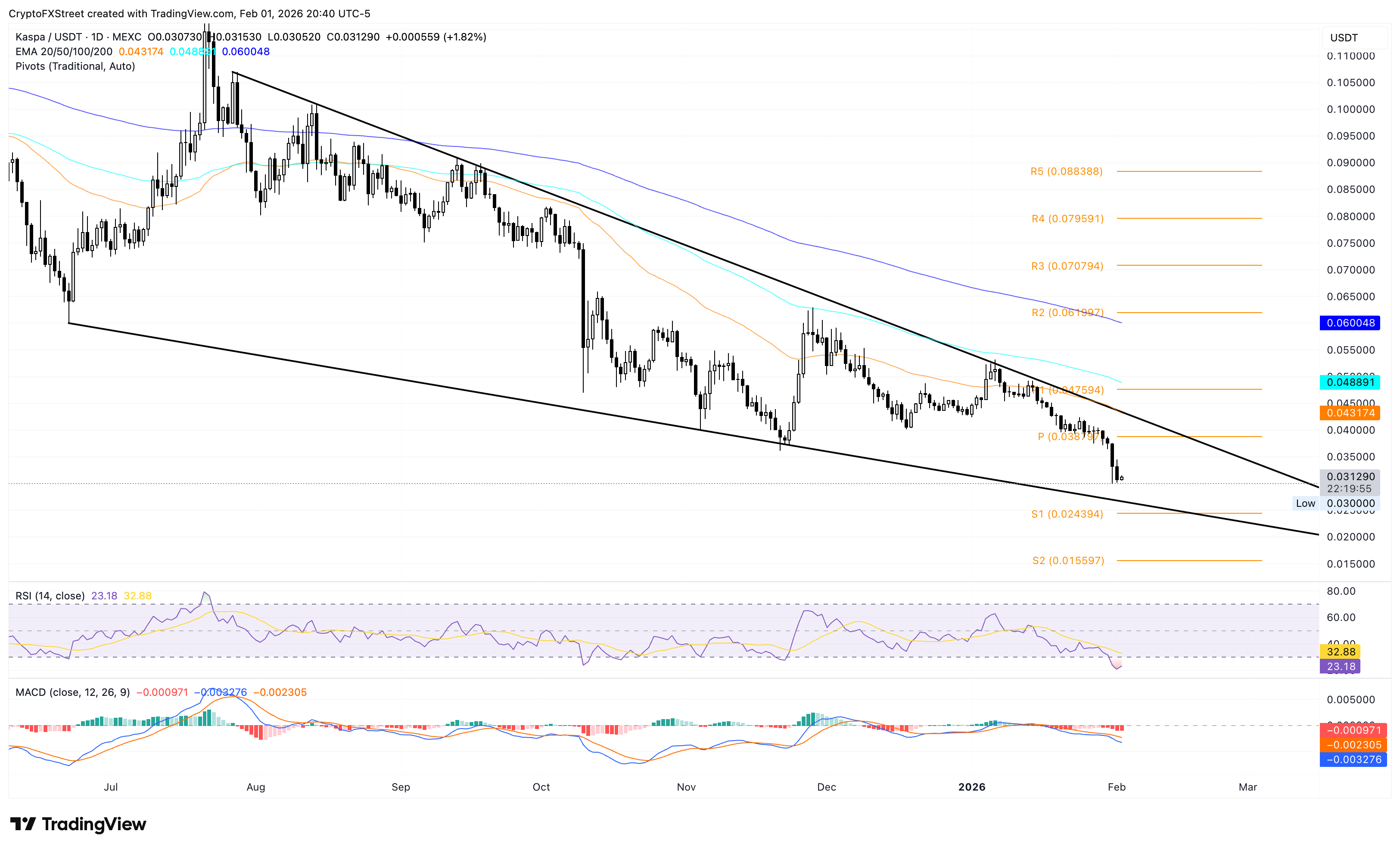 Kaspa se encuentra cerrando cerca de 0.3000$ en el momento de la redacción el lunes, continuando su caída tras una pérdida del 22% la semana pasada. La tendencia a la baja en $KAS se acerca a la línea de tendencia de soporte de un patrón de cuña descendente en el gráfico logarítmico diario, cerca del Punto Pivote S1 en 0.02439$.