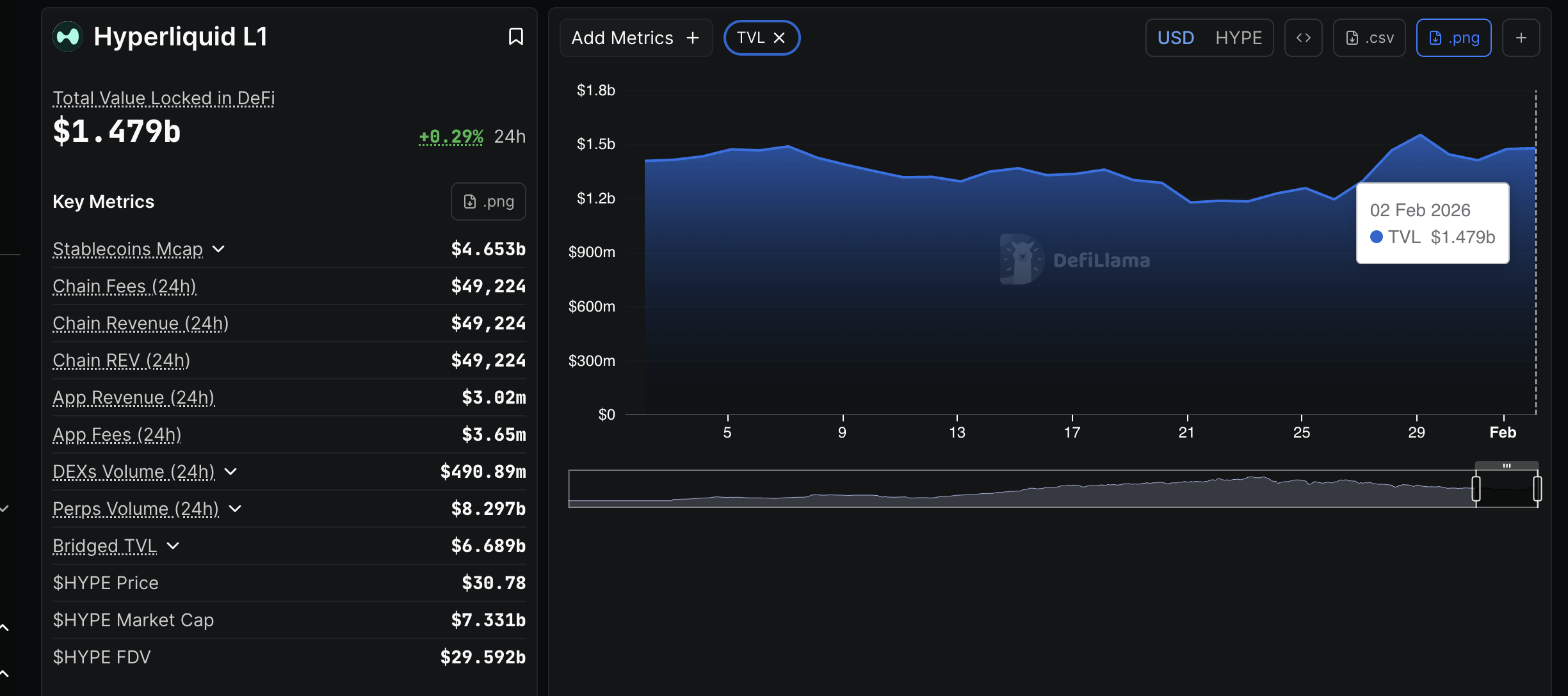 El sector de Finanzas Descentralizadas (DeFi) de Hyperliquid se ha mantenido relativamente estable en los últimos días, con el Valor Total Bloqueado (TVL) aumentando a 1.5 mil millones de dólares el lunes, desde 1.41 mil millones de dólares el sábado.
