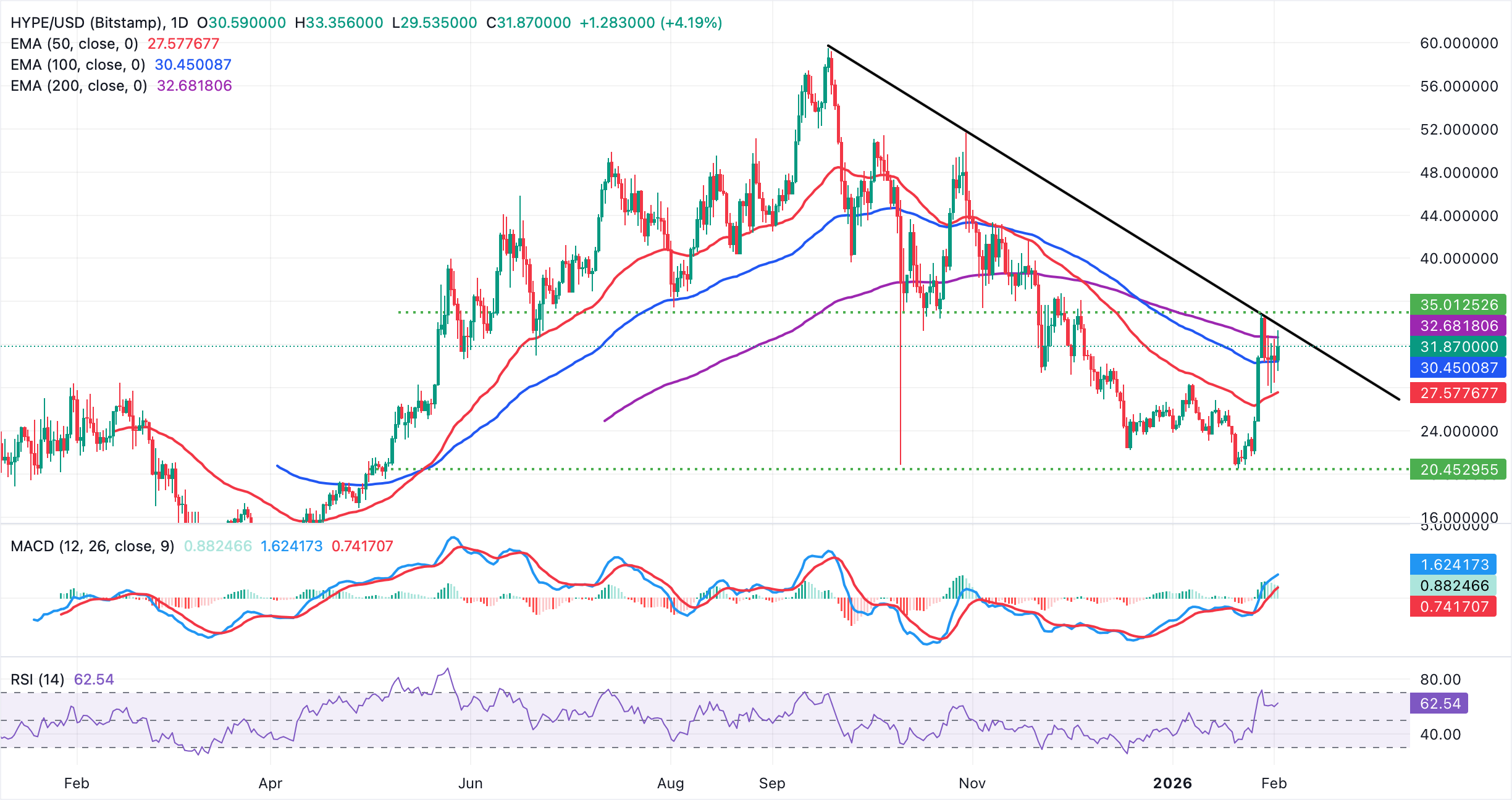 Hyperliquid exhibe estabilidad por encima de 30.00$, marcando una mejora en la estructura técnica. El token está respaldado por la media móvil exponencial (EMA) de 50 días en 27.58$ y la EMA de 100 días en 30.45$.