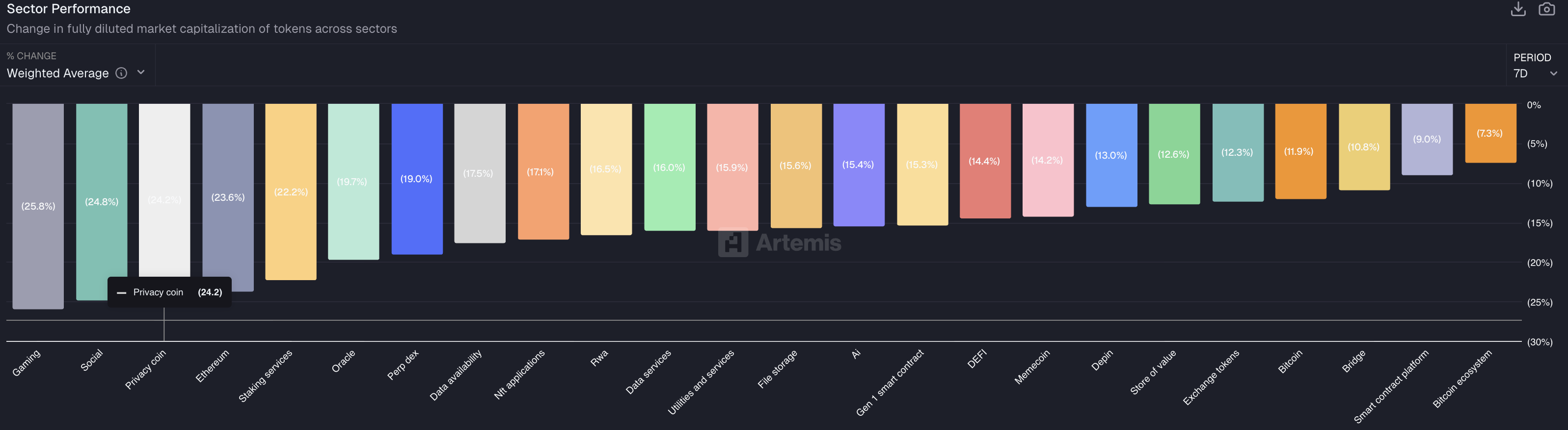 Las monedas de privacidad siguen bajo presión hasta ahora esta semana, divergendo del leve alivio observado en el mercado de criptomonedas más amplio, ya que Bitcoin (BTC) resurge por encima de los 75.000$. Los datos de Artemis muestran que el segmento de privacidad ha disminuido un 24% en la última semana, convirtiéndose en uno de los sectores de peor rendimiento después de los tokens de juegos y sociales.