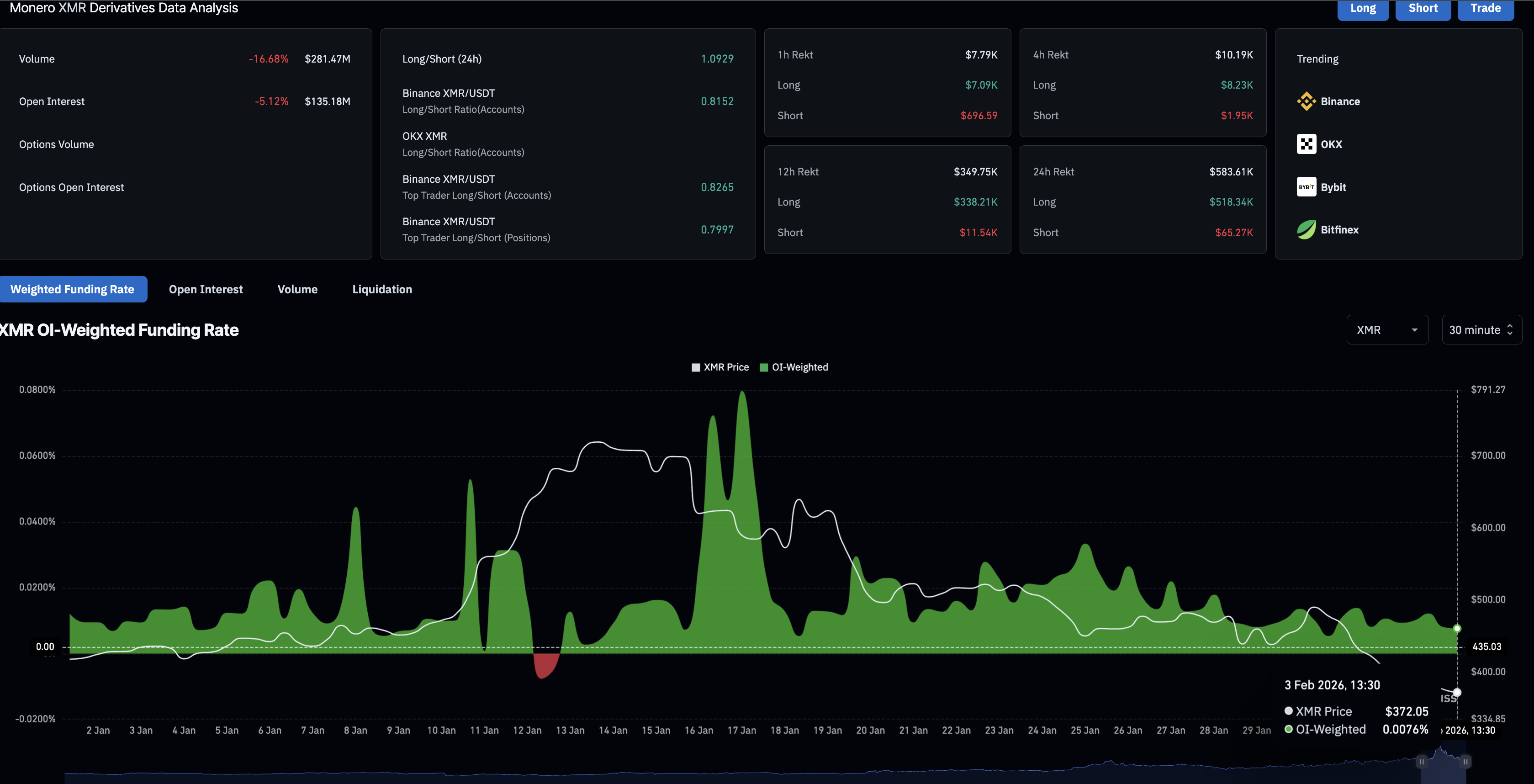 En el lado de los derivados, el tono decreciente de la fuerza minorista sigue siendo consistente. Los datos de CoinGlass indican que el Interés Abierto (OI) de futuros de $XMR disminuyó un 5.12% en las últimas 24 horas, a 135.18 millones de dólares, reflejando una reducción significativa en los contratos de futuros pendientes.