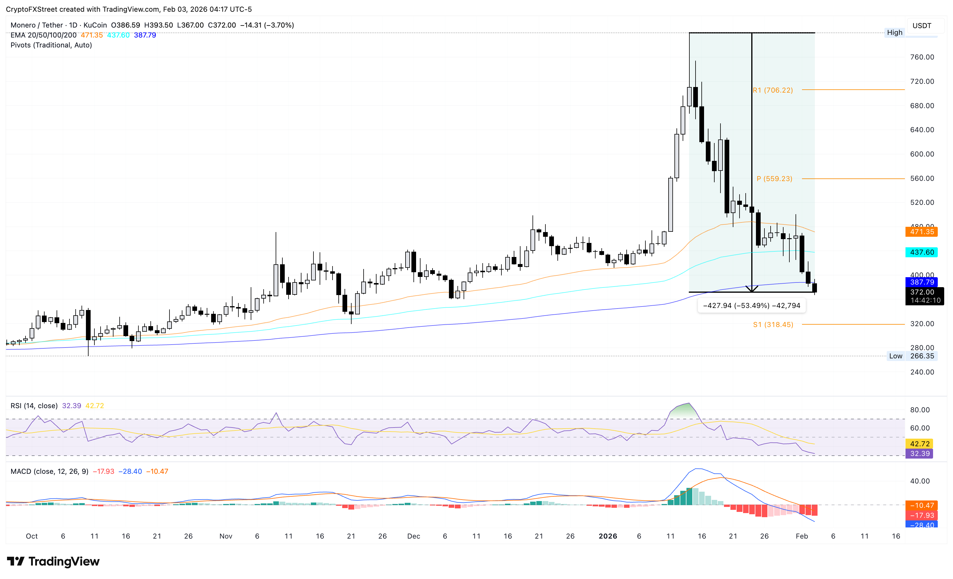 Monero ha caído por debajo de la marca de 400$ desde su pico de 800$ el 14 de enero, representando más de un 50% de declive. En el momento de escribir el martes, $XMR ha bajado un 4% en el día, cotizando por debajo de su EMA de 200 días en 387$, y acumulando una caída de aproximadamente el 20% en los últimos tres días.