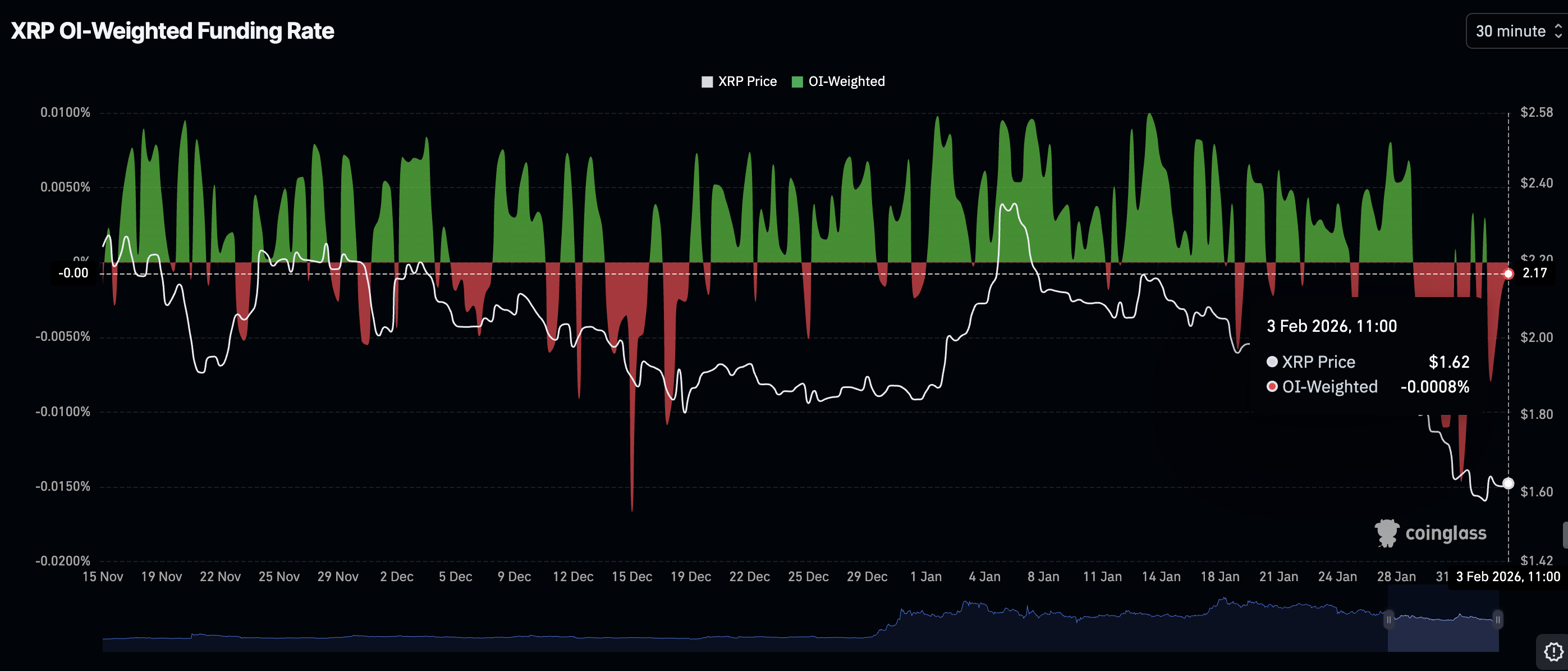 El mercado minorista se mantiene cauteloso, con los operadores cerrando posiciones en lugar de abrir nuevas. Los datos de CoinGlass muestran que la Tasa de Financiamiento Ponderada por Interés Abierto (OI) de $XRP sigue en negativo en -0.0008% el martes, subiendo desde -0.0080% el día anterior.