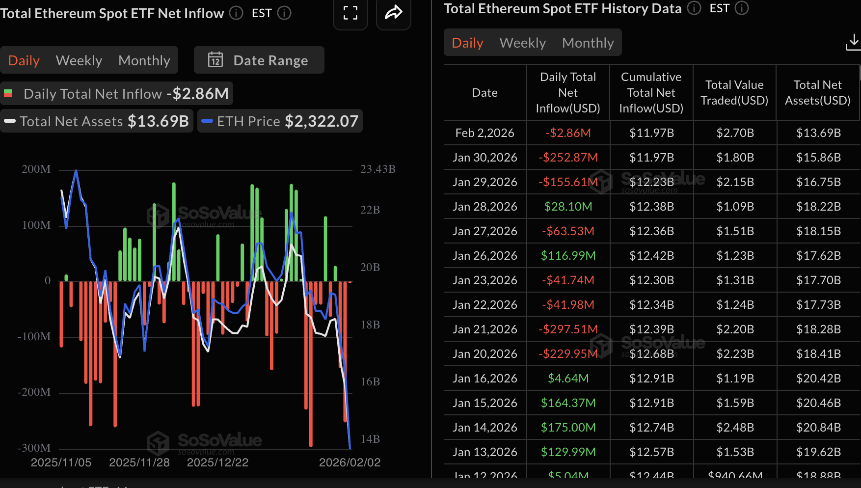 Ethereum se cotiza por debajo de 2.300 $, y el análisis técnico muestra debilidad, liderado por el indicador de Convergencia/Divergencia de Medias Móviles (MACD), que está por debajo de su línea de señal en el gráfico diario. Las barras del histograma rojo siguen expandiéndose por debajo de la línea cero, lo que podría llevar a los inversores a vender $ETH.