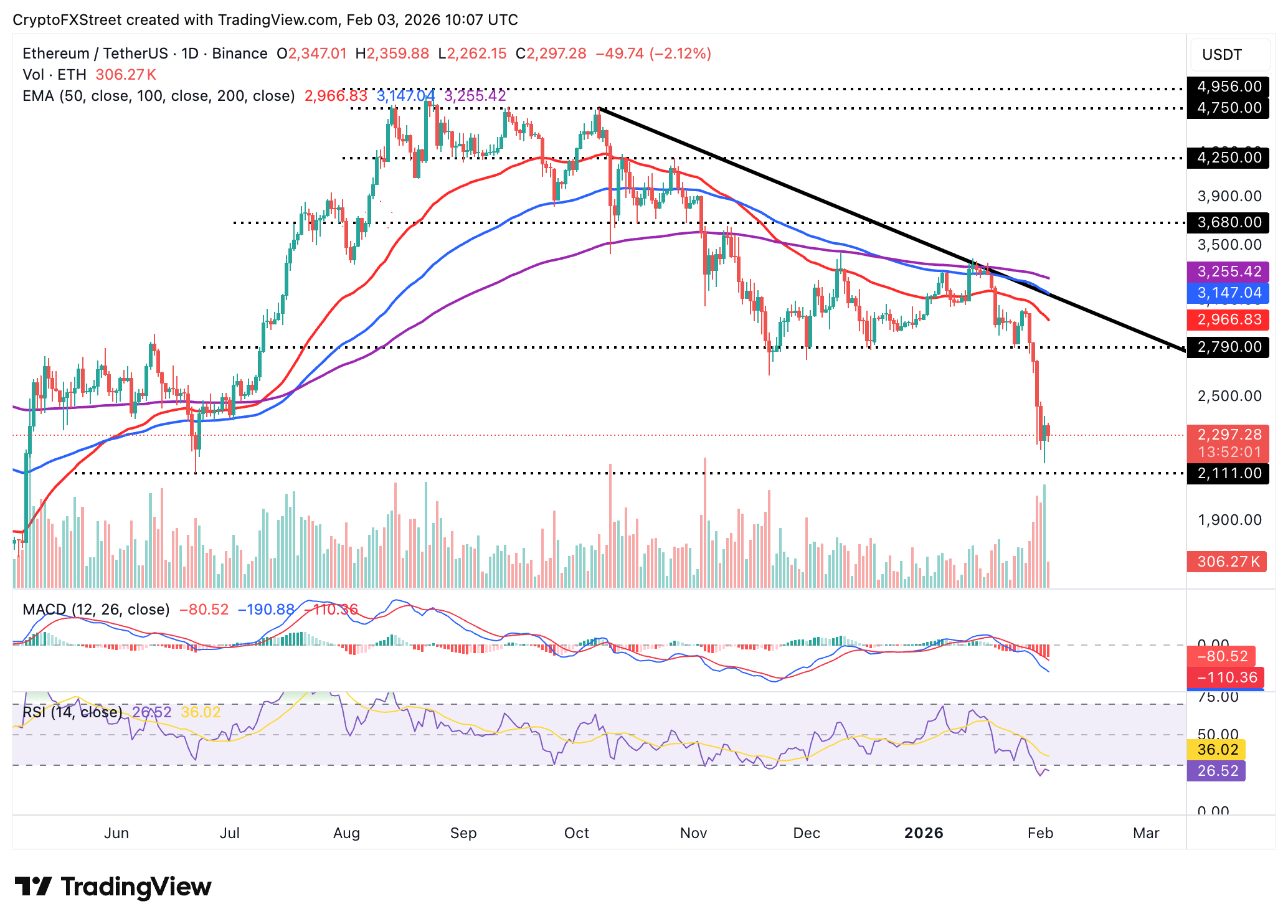 El RSI en 26.5 en el mismo gráfico está sobrevendido, señalando un intenso impulso bajista, pero también sugiere que el agotamiento de los vendedores podría resultar en una recuperación brusca hacia el máximo del domingo en 2.476 $. Por ahora, el camino con menos resistencia sigue siendo a la baja, con $ETH apuntando al mínimo del lunes en 2.157 $.