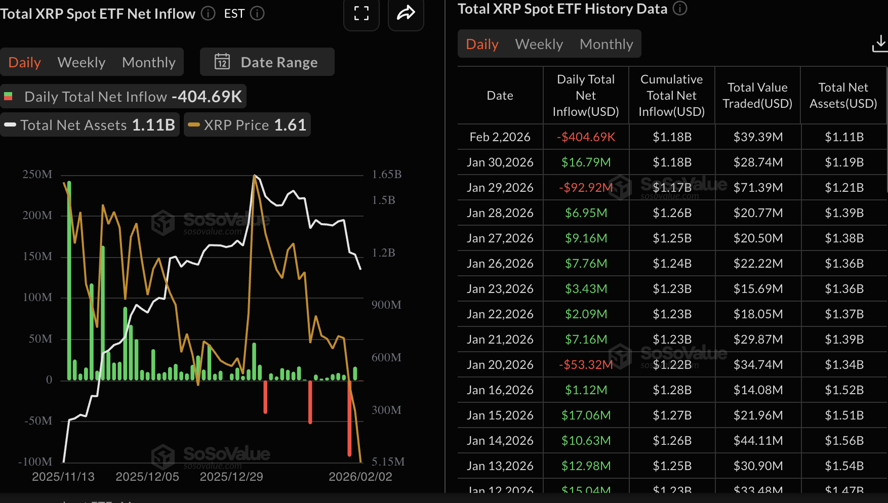 Mientras tanto, los ETF al contado de $XRP registraron salidas leves de aproximadamente 405.000 dólares el lunes, después de publicar entradas significativas de casi 17 millones de dólares el viernes. Los ETF de $XRP tienen un total acumulado de 1.18 mil millones de dólares, mientras que los activos netos totales bajo gestión se sitúan en 1.11 mil millones de dólares, según datos de SoSoValue.