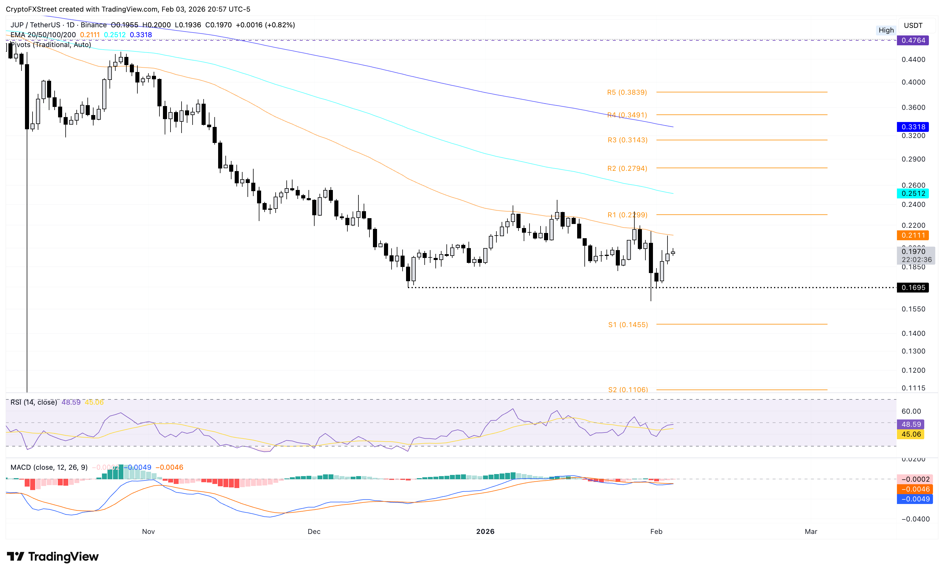 En un retroceso, el soporte clave para $JUP sigue siendo el mínimo del 18 de diciembre en 0.1695$.