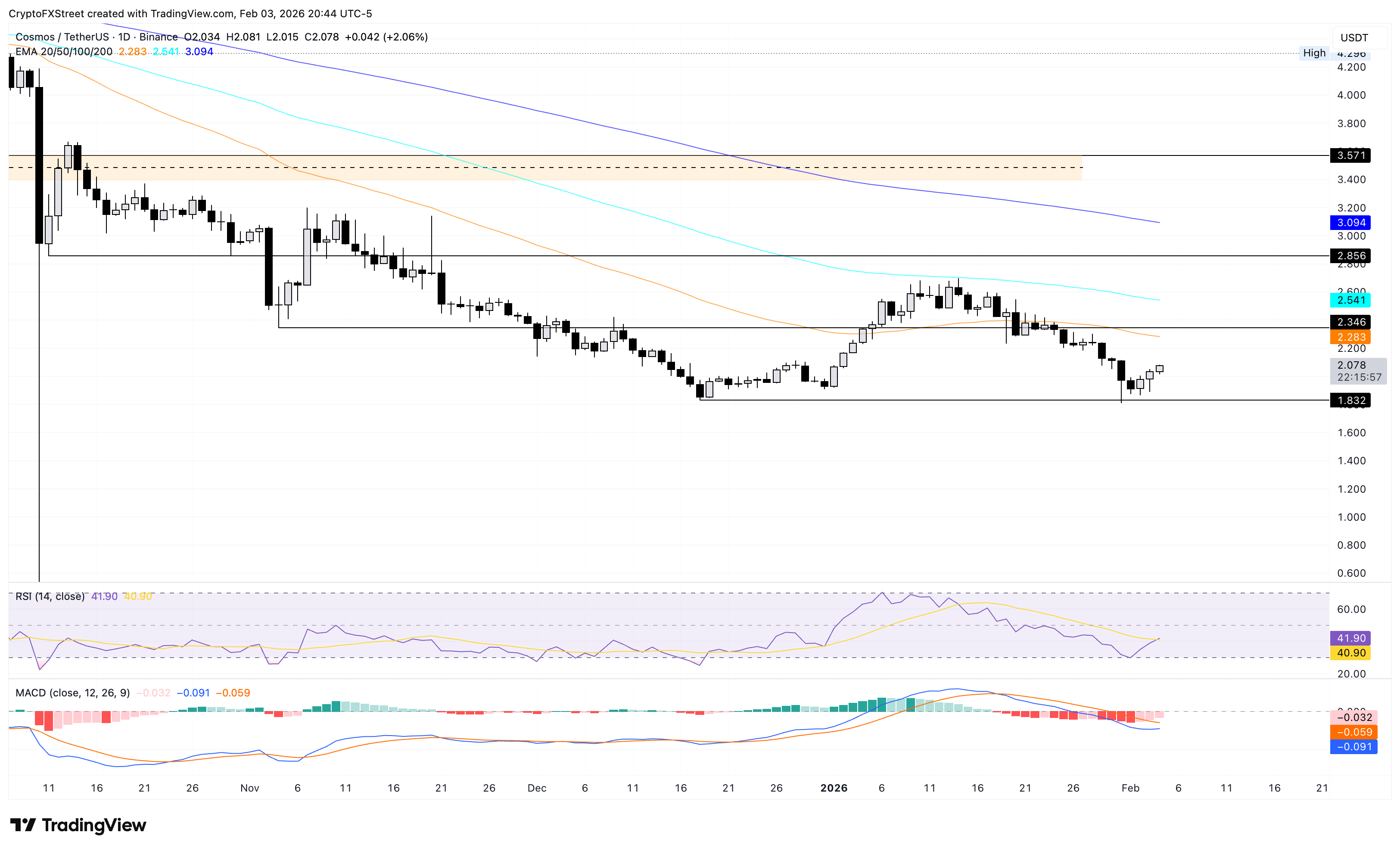 $ATOM cotiza un 2% al momento de escribir el miércoles, extendiendo su recuperación por tercer día consecutivo, ahora con más del 8%. Aún así, $ATOM se mantiene por debajo de las EMAs de 50, 100 y 200 días en 2.283$, 2.541$ y 3.094$, respectivamente. La EMA de 50 días está por debajo de la EMA de 100 días, reforzando un sesgo bajista.