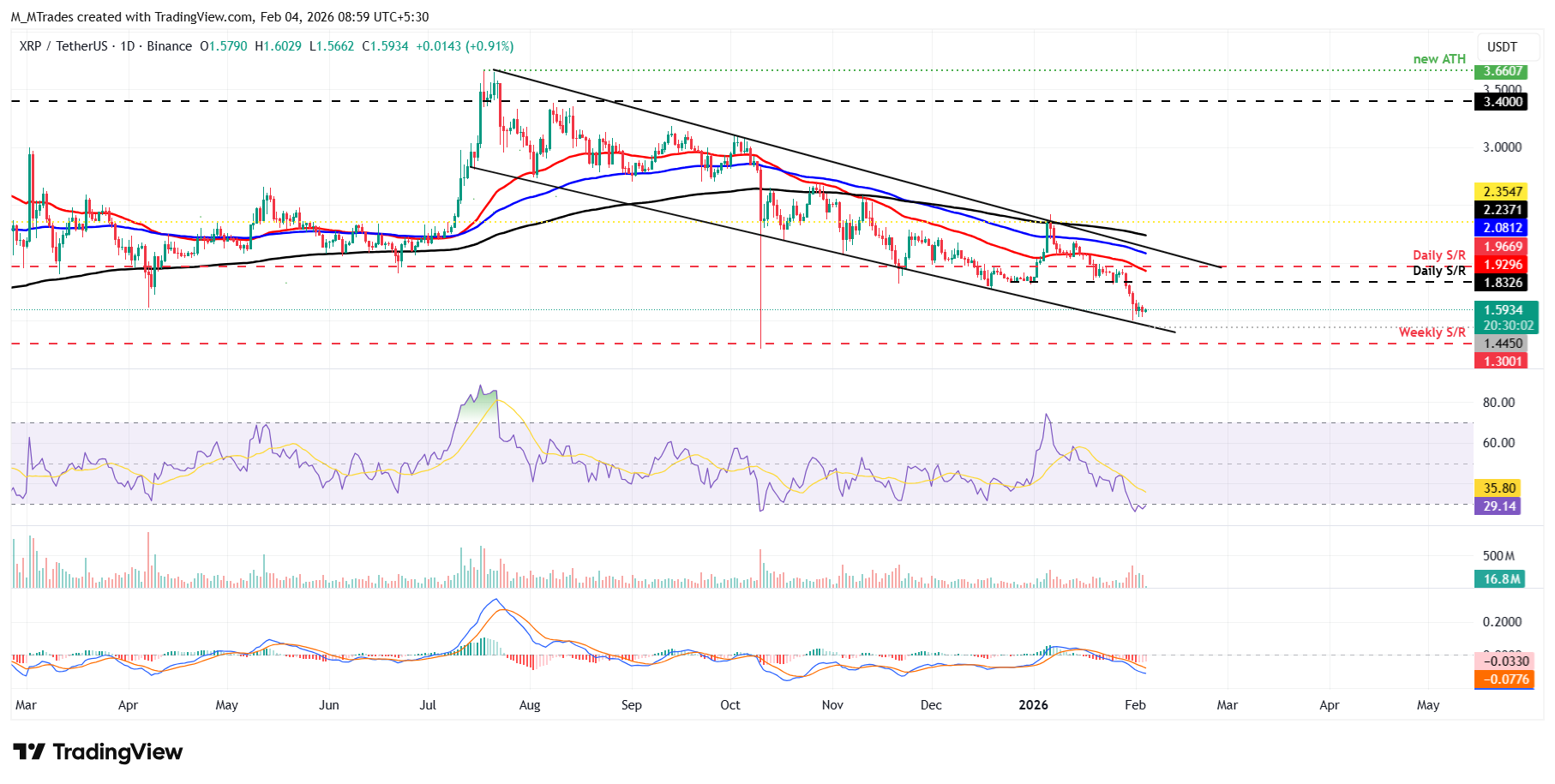 El precio de $XRP cerró por debajo del soporte diario en 1.83 $ la semana pasada y ha estado cotizando a la baja hacia el límite de la línea de tendencia inferior del patrón de cuña descendente alrededor de 1.44 $ hasta ahora esta semana. Al momento de escribir el miércoles, $XRP cotiza a 1.59 $.