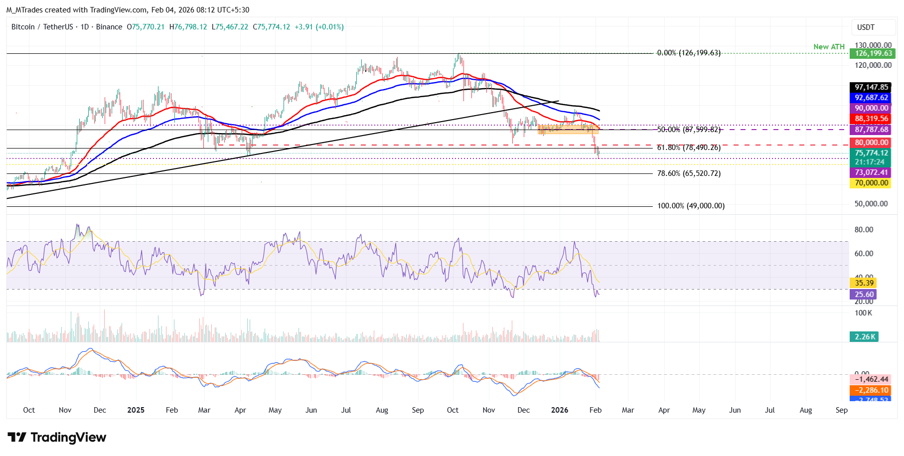 El precio de Bitcoin cerró por debajo del nivel de retroceso de Fibonacci del 61.8% (desde el mínimo de agosto de 2024 de 49.000 $ hasta el máximo histórico de octubre de 2025 de 126.199 $) en 78.490 $ el domingo. Corrigió casi un 4%, tocando un mínimo de 72.945 $ el martes (un nivel no visto desde principios de noviembre de 2024). Al momento de escribir el miércoles, $BTC cotiza a 75.700 $.