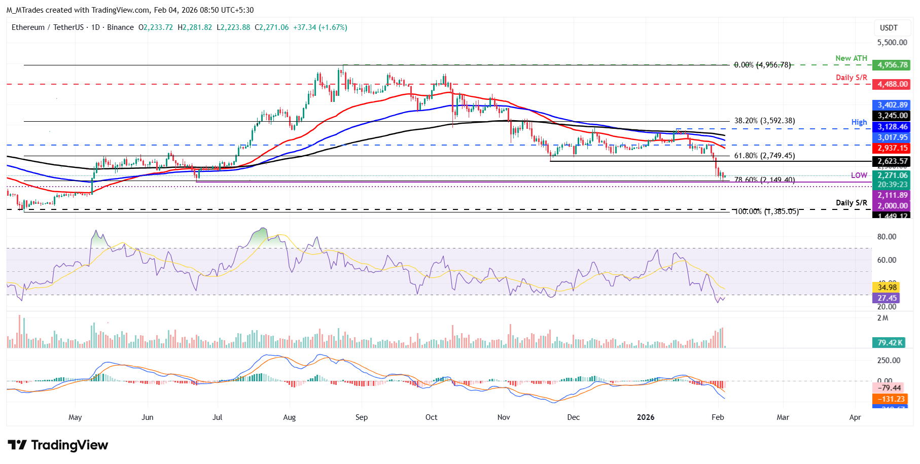 Al igual que Bitcoin, los indicadores RSI y MACD de Ethereum en el gráfico diario están mostrando una fuerte fuerza bajista.