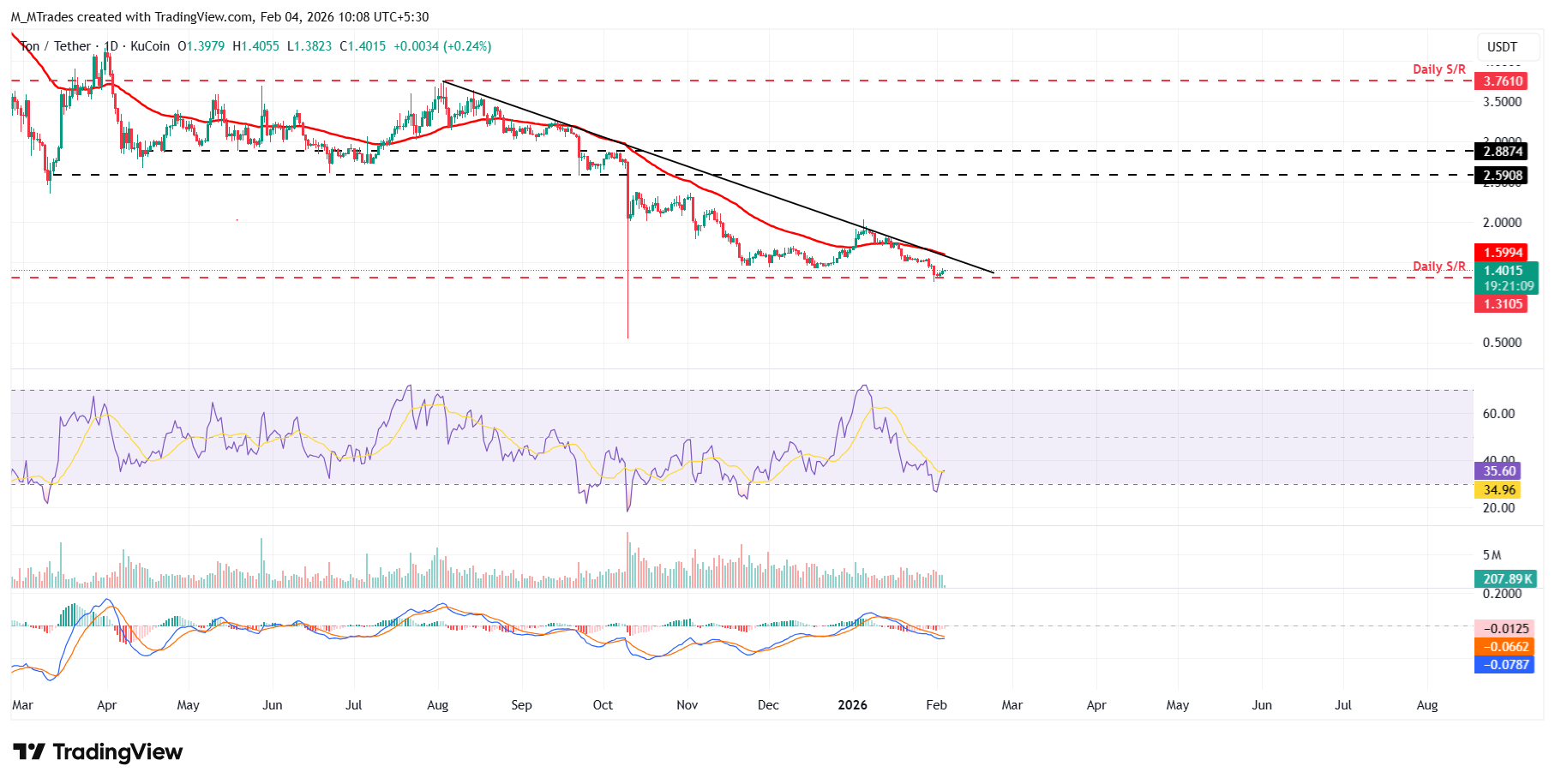 Por otro lado, si $TON enfrenta una corrección, podría extender el declive hacia el soporte diario en 1.31$.