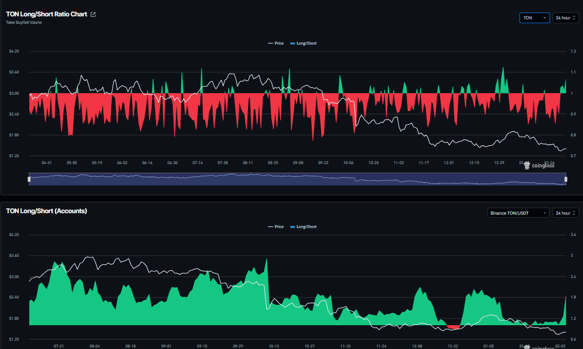 Los datos de CoinGlass muestran que el ratio de largas a cortas de Toncoin es de 1.06 el miércoles y ha estado aumentando de manera constante. El ratio por encima de uno refleja un sentimiento alcista en los mercados, ya que más operadores están apostando a que el precio del activo suba. Además, las apuestas largas en el intercambio Binance alcanzaron 1.84 el miércoles, el nivel más alto desde el 7 de enero, apoyando aún más la tesis de recuperación.