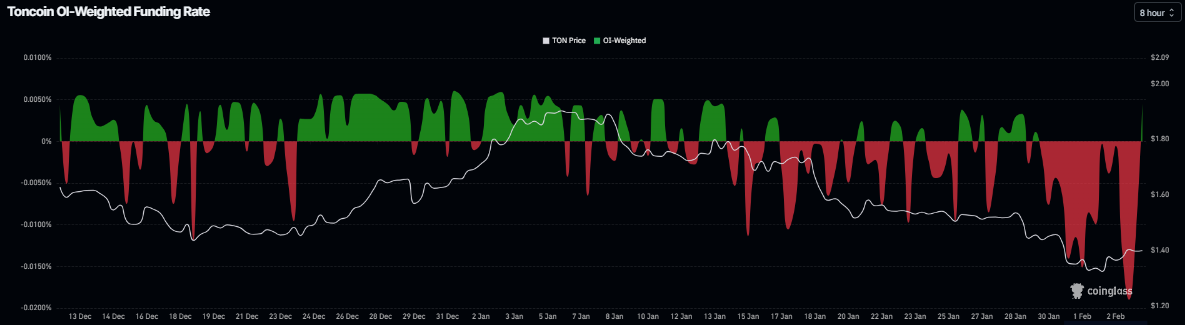 Los datos de la tasa de financiación ponderada por OI de CoinGlass muestran que el número de operadores que apuestan a que el precio de $TON caerá más es menor que el de aquellos que anticipan un aumento del precio.