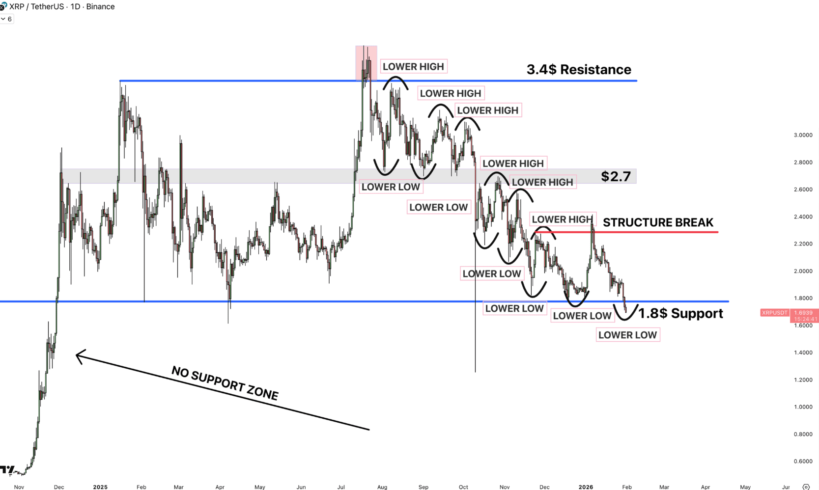 La recuperación del $XRP hasta USD 2,40 en enero resultó ser una "falsa alarma", ya que el precio siguió formando "nuevos mínimos", según afirmó el analista pseudónimo AltCryptoGems en una publicación reciente en X, añadiendo: