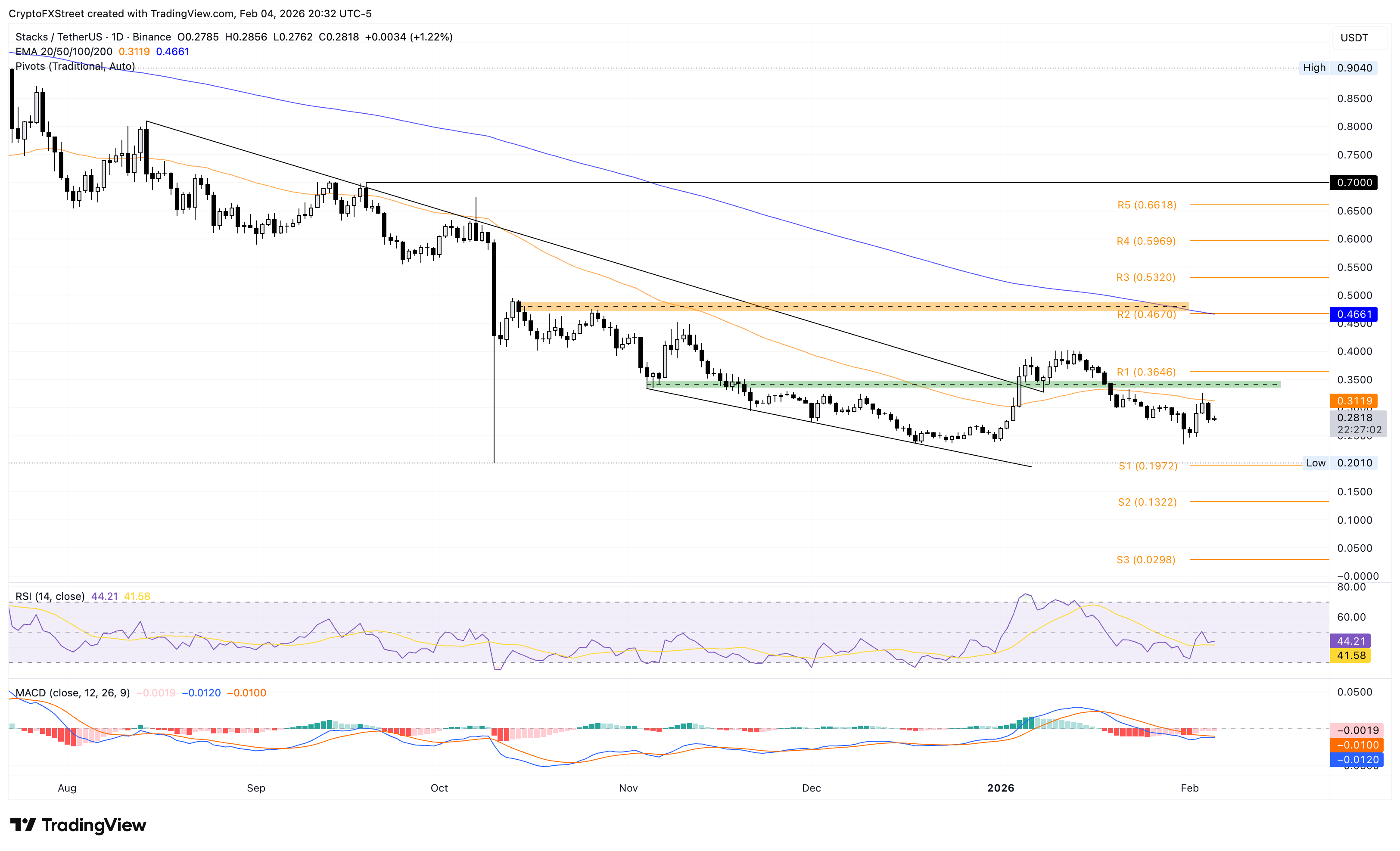 Stacks avanza ligeramente en el momento de la publicación el jueves tras una caída del 10% el día anterior. La EMA de 50 días en 0.3119$ limitó las ganancias el miércoles, manteniendo un sesgo bajista.
