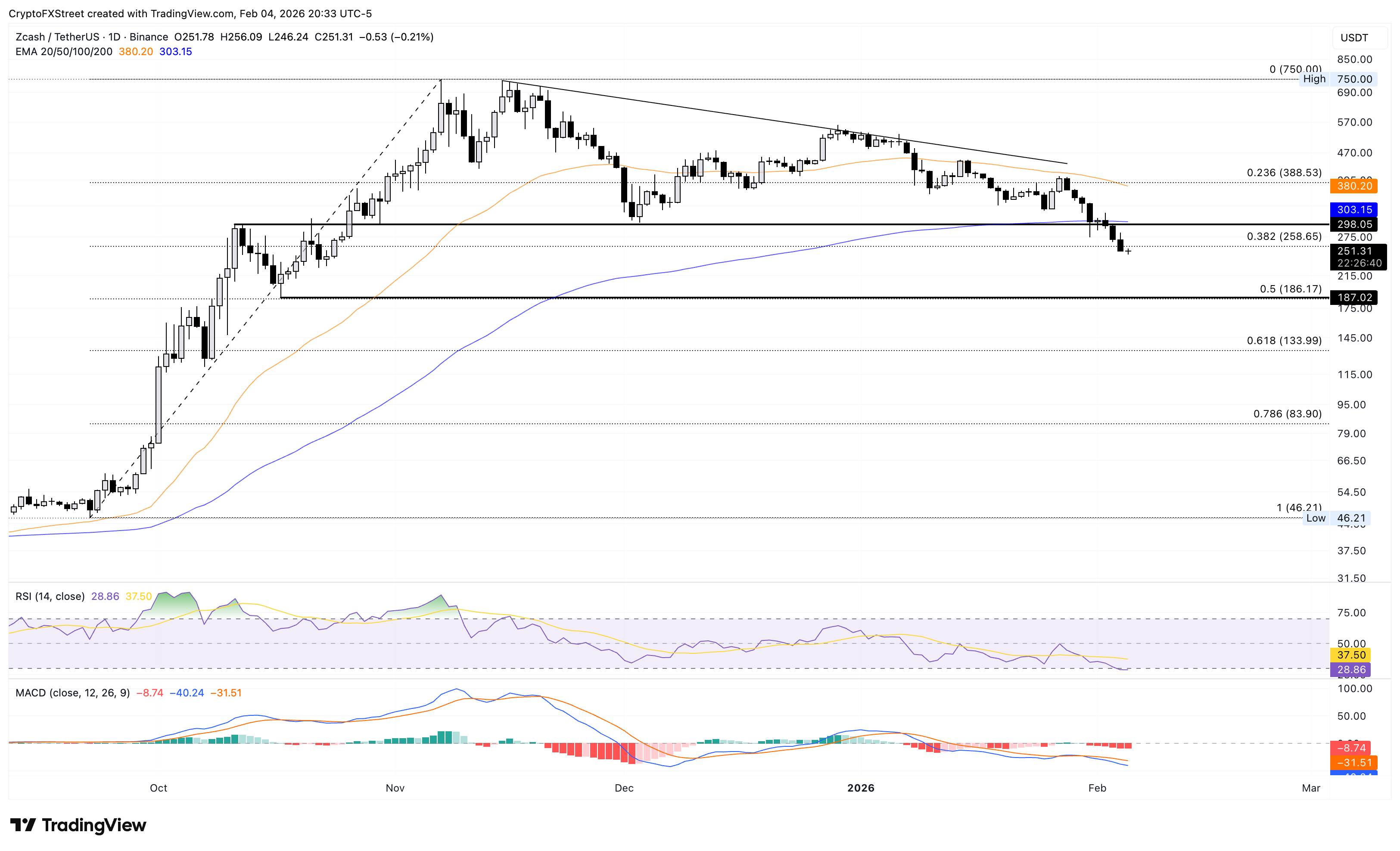 Zcash ha bajado aproximadamente un 20% hasta ahora esta semana, apuntando al nivel de retroceso del 50% en 186$.