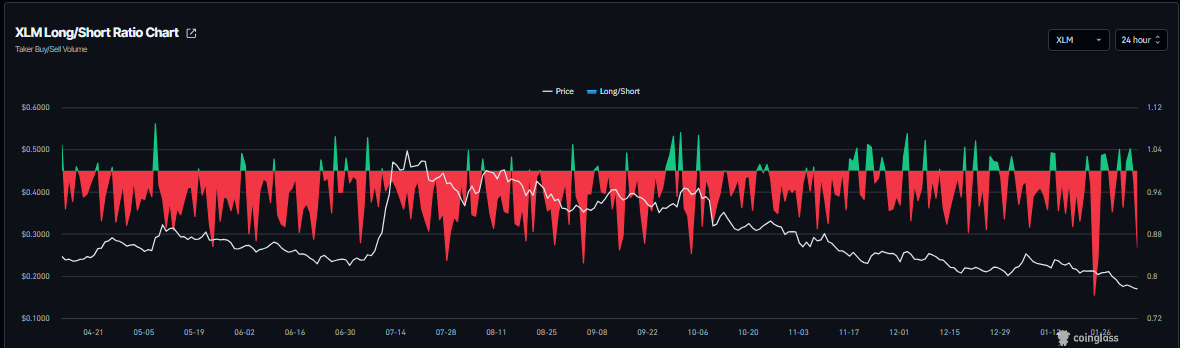 El ratio largo-corto de $XLM de CoinGlass se sitúa en 0.85 el jueves, acercándose al valor más bajo en un mes. Este ratio, por debajo de uno, refleja un sentimiento bajista en los mercados, ya que más operadores están apostando a que el precio del activo caerá.