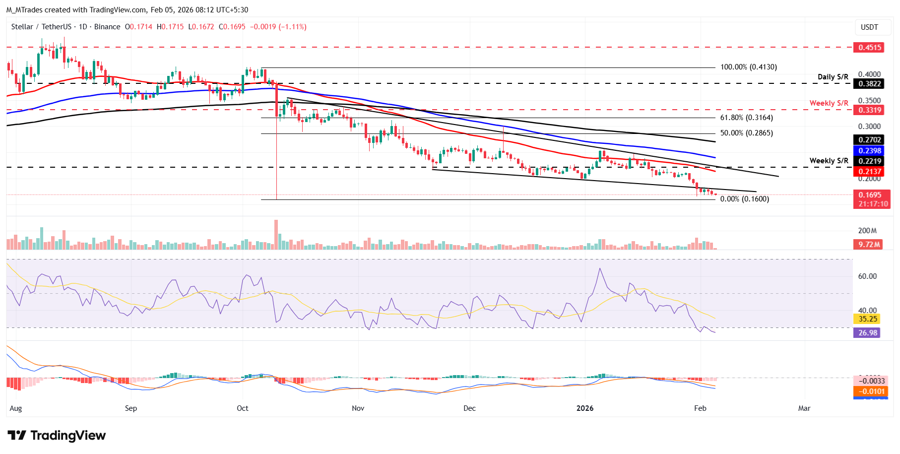Si $XLM continúa su corrección, podría extender la caída hacia el mínimo anual de 2025 de 0.160 $, establecido el 10 de octubre.