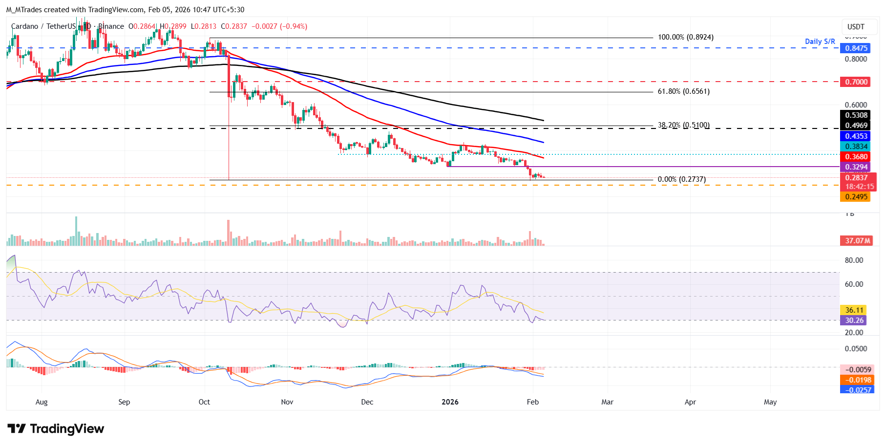 Si $ADA continúa su tendencia a la baja, podría extender la caída hacia el mínimo del 21 de octubre de 2023, que es de 0.24$.