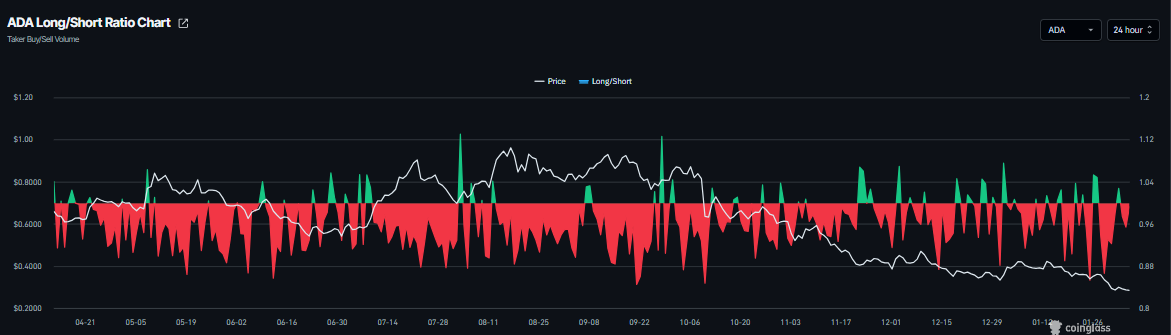 Además, el ratio largo-corto de $ADA de CoinGlass se sitúa en 0.95 el jueves. Este ratio, por debajo de uno, refleja un sentimiento bajista en los mercados, ya que más operadores están apostando a que el precio del activo caerá.