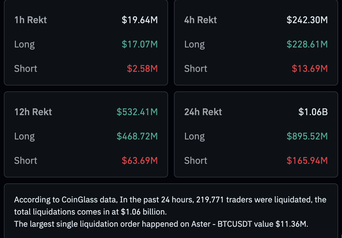 Los operadores de posiciones largas soportaron la mayor parte de la corrección, con aproximadamente 896 millones de dólares eliminados. Los tenedores de posiciones cortas, por otro lado, perdieron casi 166 millones de dólares en el mismo período de 24 horas.