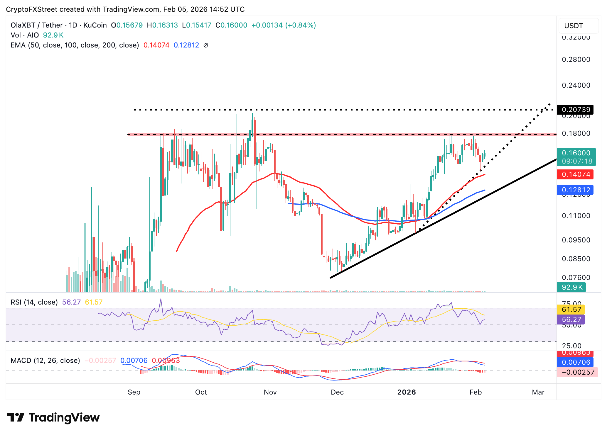 OlaXBT también avanza, cotizando por encima de 0.16 $ en el momento de escribir este artículo el jueves, reflejando un mayor interés de los operadores que buscan oportunidades en los nuevos tokens de IA lanzados. AIO se mantiene bien por encima de la EMA de 50 días, proporcionando soporte en 0.14 $ y la EMA de 100 días en 0.13 $. La línea de tendencia acelerada (punteada) está lista para absorber la presión de venta si la tendencia se invierte, mientras que la línea de tendencia lenta está posicionada por debajo de la EMA de 100 días.