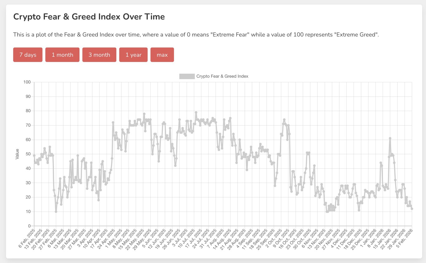 De la avaricia al miedo. La situación es clarísima si atendemos al Índice de Avaricia y Miedo (Fear & Greed Index) de firmas como Alternative, que lo sitúan en un valor de 12, o lo que es lo mismo, "Miedo extremo". Este índice estudia movimientos y análisis del mercado para dar ese número que es un gran resumen del escenario que vivimos. Durante buena parte de 2025 ese nivel estuvo por encima del 50 y llegó a rozar el 80 (avaricia extrema), pero el bajón actual es evidente.